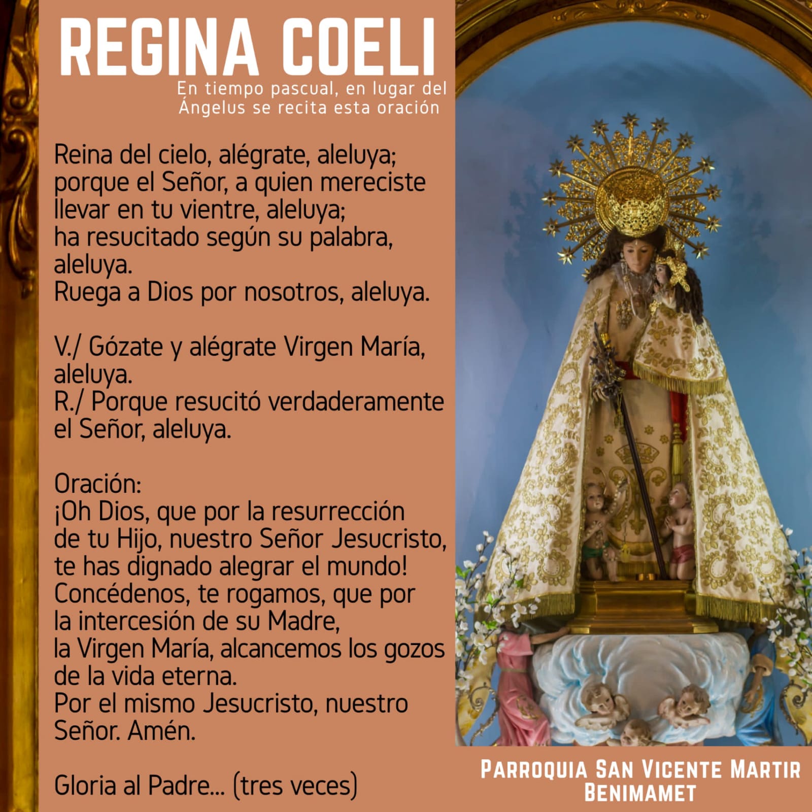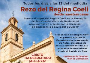 Regina Coeli abril 13, 2020 de marhuendasalazar En el tiempo Pascual, se sustituye el rezo del Ángelus por el «Regina Coeli», la oración propia de este tiempo. Compartir: Haz clic para compartir en Facebook (Se abre en una ventana nueva) Facebook Haz clic para compartir en X (Se abre en una ventana nueva) X Haz clic para enviar un enlace por correo electrónico a un amigo (Se abre en una ventana nueva) Correo electrónico Haz clic para imprimir (Se abre en una ventana nueva) Imprimir Me gusta Cargando... Relacionado