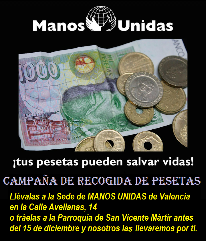 Recogida de pesetas MANOS UNIDAS noviembre 10, 2020 de marhuendasalazar Una campaña para emplear solidariamente las pesetas que dejarán de tener valor Más información Compartir: Haz clic para compartir en Facebook (Se abre en una ventana nueva) Facebook Haz clic para compartir en X (Se abre en una ventana nueva) X Haz clic para enviar un enlace por correo electrónico a un amigo (Se abre en una ventana nueva) Correo electrónico Haz clic para imprimir (Se abre en una ventana nueva) Imprimir Me gusta Cargando... Relacionado
