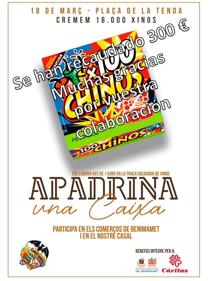 La recaudación ha ascendido a 300 euros que se repartirán entre las Cáritas del Ave María y San José y San Vicente Mártir. Muchas gracias por vuestra colaboración y solidaridad.