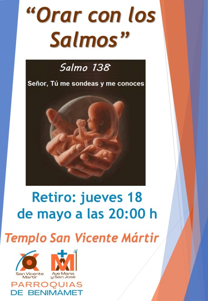 El jueves 18, tendremos, después de la Eucaristía, el RETIRO: Lo mismo que necesitamos ejercitarnos tanto intelectual como físicamente, y lo vemos normal y lógico, lo debemos de hacer espiritualmente. El tiempo para hacer Ejercicios Espirituales es mucho más prolongado, y muchas veces creemos que no tenemos tiempo. Por eso para facilitar las cosas, a la hora de ejercitarnos, una vez al mes, en la Comunidad Parroquial, desde hace ya 10 años los venimos haciendo. En este Ciclo Pastoral lo haremos sobre los “SALMOS”. Este jueves meditaremos el “Salmo 138”. No dejes de ejercitarte espiritualmente, lo necesitas. ¡El Señor te espera!