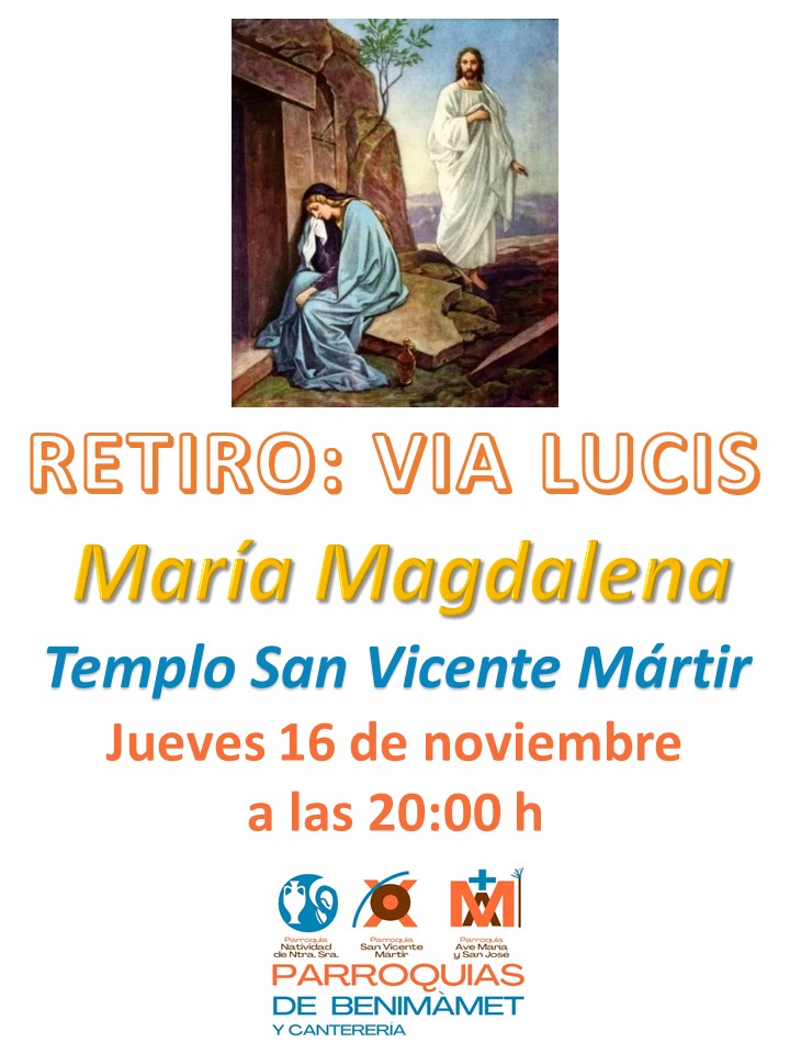 El jueves 16, tendremos, después de la Eucaristía, el RETIRO: Lo mismo que necesitamos ejercitarnos tanto intelectual como físicamente, y lo vemos normal y lógico, lo debemos de hacer espiritualmente. El tiempo para hacer Ejercicios Espirituales es mucho más prolongado, y muchas veces creemos que no tenemos tiempo. Por eso para facilitar las cosas, a la hora de ejercitarnos, una vez al mes, en la Comunidad Parroquial, desde hace ya 11 años, los venimos haciendo. En este Ciclo Pastoral lo haremos meditando el “VIA LUCIS”. Este jueves meditaremos con “MARÍA MAGDALENA”. No dejes de ejercitarte espiritualmente, lo necesitas. ¡El Señor te espera!