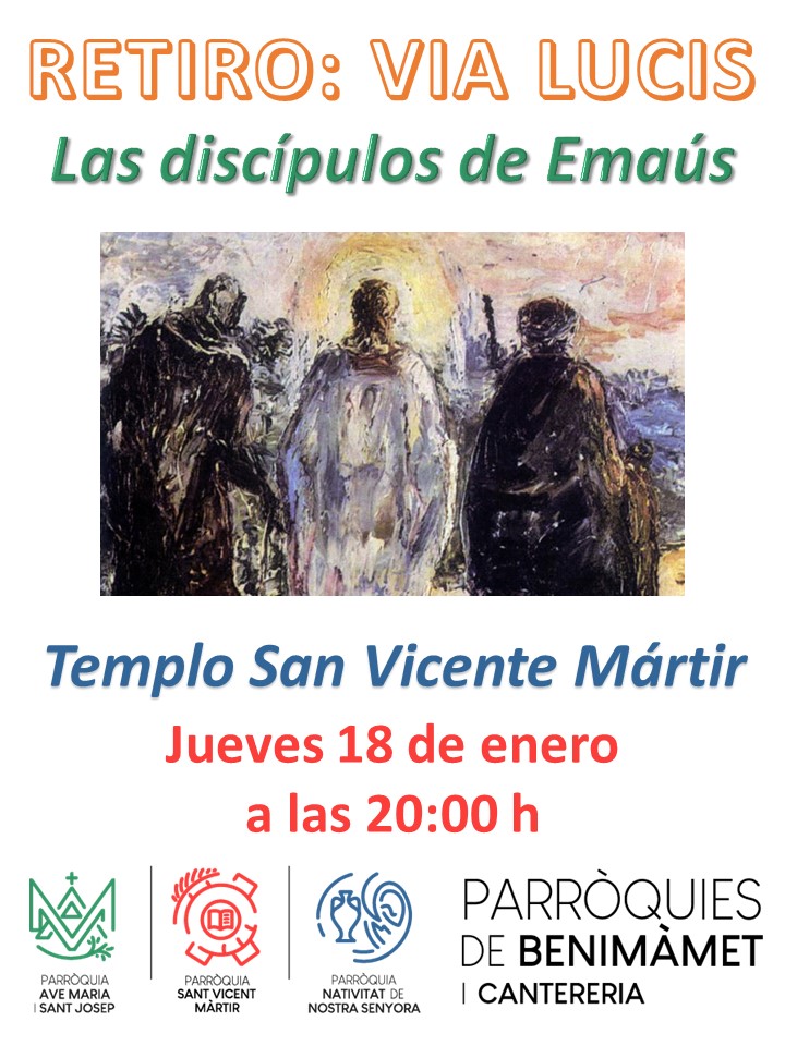 El jueves 18, tendremos, después de la Eucaristía, el RETIRO: Lo mismo que necesitamos ejercitarnos tanto intelectual como físicamente, y lo vemos normal y lógico, lo debemos de hacer espiritualmente. El tiempo para hacer Ejercicios Espirituales es mucho más prolongado, y muchas veces creemos que no tenemos tiempo. Por eso para facilitar las cosas, a la hora de ejercitarnos, una vez al mes, en la Comunidad Parroquial, desde hace ya 11 años, los venimos haciendo. En este Ciclo Pastoral lo haremos meditando el “VIA LUCIS”. Este jueves meditaremos con “LOS DISCÍPULOS DE EMAÚS”. No dejes de ejercitarte espiritualmente, lo necesitas. ¡El Señor te espera!