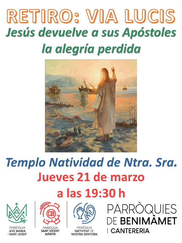 El jueves 21, tendremos, en la Parroquia de la Natividad de Ntra. Sra., el RETIRO: Lo mismo que necesitamos ejercitarnos tanto intelectual como físicamente, y lo vemos normal y lógico, lo debemos de hacer espiritualmente. El tiempo para hacer Ejercicios Espirituales es mucho más prolongado, y muchas veces creemos que no tenemos tiempo. Por eso para facilitar las cosas, a la hora de ejercitarnos, una vez al mes, en la Comunidad Parroquial, desde hace ya 11 años, los venimos haciendo. En este Ciclo Pastoral lo haremos meditando el “VIA LUCIS”. Este jueves meditaremos con “JESÚS DEVUELVE A SUS APÓSTOLES LA ALEGRÍA PERDIDA”. No dejes de ejercitarte espiritualmente, lo necesitas. ¡El Señor te espera!
