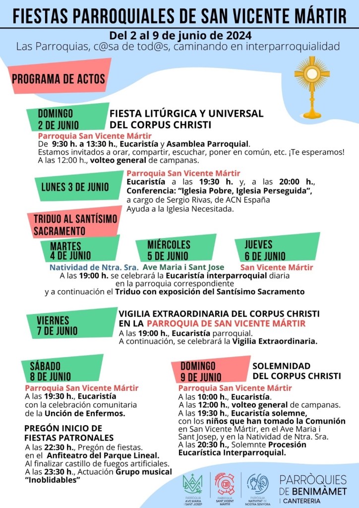 Como ya sabéis en unos días celebraremos la Semana Parroquial que queda enmarcada dentro de las Fiestas del Corpus. Una semana que dará comienzo con la celebración de la Asamblea Parroquial y que finalizará con la procesión del Corpus por las calles de Benimàmet. Es buena ocasión para evaluar nuestro objetivo: “Las parroquias, c@sa de tod@s, caminando en interparroquialidad”.