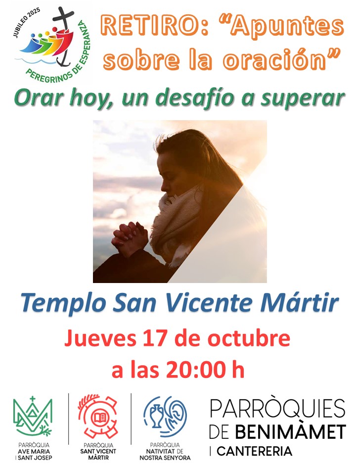 El jueves 17, tendremos, el RETIRO, a las 20:00 h. Lo mismo que necesitamos ejercitarnos tanto intelectual como físicamente, y lo vemos normal y lógico, lo debemos de hacer espiritualmente. El tiempo para hacer Ejercicios Espirituales es mucho más prolongado, y muchas veces creemos que no tenemos tiempo. Por eso, para facilitar las cosas, a la hora de ejercitarnos, los venimos haciendo una vez al mes. En este Ciclo Pastoral, dentro del Jubileo de la Esperanza, y del Plan Diocesano, lo hacemos con los APUNTES SOBRE LA ORACIÓN, con el Cuaderno 1. Este jueves meditaremos, “ORAR HOY, UN DESAFÍO A SUPERAR”. No dejes de ejercitarte espiritualmente, lo necesitas. ¡El Señor te espera!