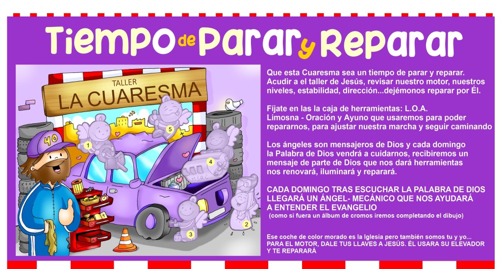 Nos dice nuestro querido Patxi Fano: «Queridos amigos os compartimos el material de cuaresma, un regalo ser cauce y compartir la Palabra de Dios para este tiempo… en este enlace están los dibujos y explicaciones. También os comparto la canción y el video que ha preparado Unai Quirós una alegría trabajar juntos por el Reino. A parar y reparar, paremos el coche dejémosle a Jesús nuestra llaves y dejémonos hacer por Él».