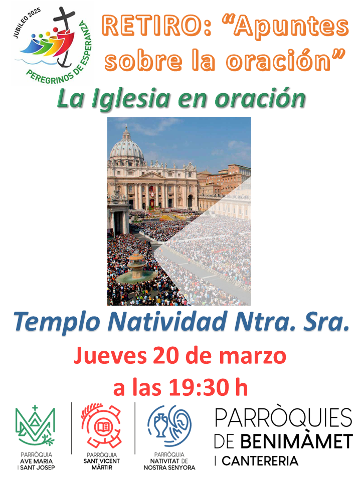 El jueves 20, tendremos, el RETIRO, a las 19:30 h. en el Templo de la Natividad. Lo mismo que necesitamos ejercitarnos tanto intelectual como físicamente, y lo vemos normal y lógico, lo debemos de hacer espiritualmente. El tiempo para hacer Ejercicios Espirituales es mucho más prolongado, y muchas veces creemos que no tenemos tiempo. Por eso, para facilitar las cosas, a la hora de ejercitarnos, los venimos haciendo una vez al mes. En este Ciclo Pastoral, dentro del Jubileo de la Esperanza, y del Plan Diocesano, lo hacemos con los APUNTES SOBRE LA ORACIÓN, con el Cuaderno 6. Este jueves meditaremos, “LA IGLESIA EN ORACIÓN”. No dejes de ejercitarte espiritualmente, lo necesitas. ¡El Señor te espera!