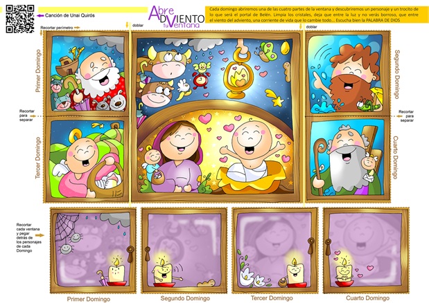 Buenas, os comparto los materiales del adviento «La ventana de la PAZ». Abramos la ventana para que entre una nueva luz que lo ilumine todo. Limpiemos los cristales para dejar de ver borroso. Limpiemos telarañas y dejemos que entre una nueva corriente, el VIENTO del ADVIENTO, que lo renueve y oxigene todo. Cada domingo abrimos una parte de la ventana y descubrimos un personaje de la palabra de Dios que nos manda un mensaje: