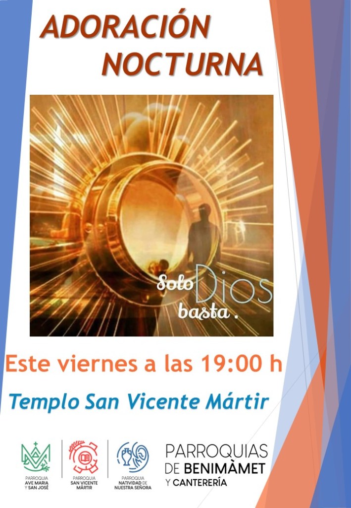 Los cuartos viernes de cada mes tenemos la ADORACIÓN NOCTURNA. Estamos delante del Santísimo en Adoración – Contemplación – Alabanza – Acción de Gracias – Oración… Junto con la oración de las Vísperas, estamos media hora en silencio (con música de fondo) escuchando al Señor, preguntándonos: ¿Señor, qué quieres de mí? Antes de la Reserva del Santísimo rezamos las Completas. “El Señor te espera”.