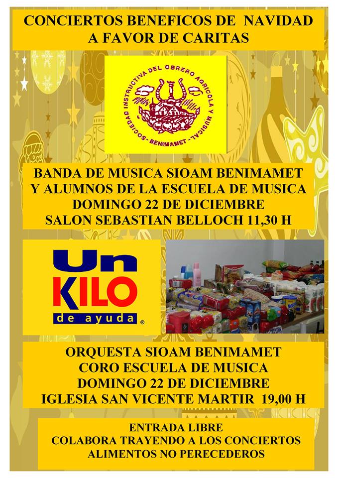 El domingo 22 se realizo el Concerto Solidario de Navidad, gracias a la Orquesta SIOAM, y el Coro de la escuela de música, a su Directora Dª Carolina Montalt, a su Presidente D. Sebastián Belloch Marín y su Junta directiva, por colaborar con Cáritas Parroquial.