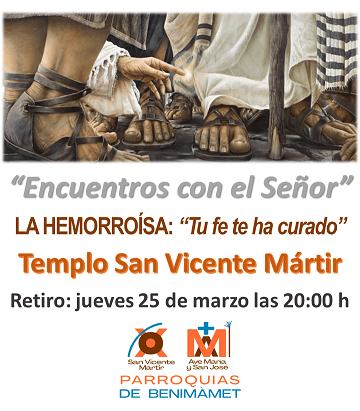 El jueves 25, tendremos, después de la Eucaristía, el RETIRO: Lo mismo que necesitamos ejercitarnos tanto intelectual como físicamente, y lo vemos normal y lógico, lo debemos de hacer espiritualmente. El tiempo para hacer Ejercicios Espirituales es mucho más prolongado, y muchas veces creemos que no tenemos tiempo. Por eso para facilitar las cosas, una vez al mes, en la Comunidad Parroquial, desde hace ya 8 años los venimos haciendo. En este Ciclo Pastoral continuaremos centrándonos en los “Encuentros con el Señor”. Este jueves meditaremos LA EMORROÍSA: “Tu fe te ha curado”. No dejes de ejercitarte espiritualmente, lo necesitas. El Señor te espera.